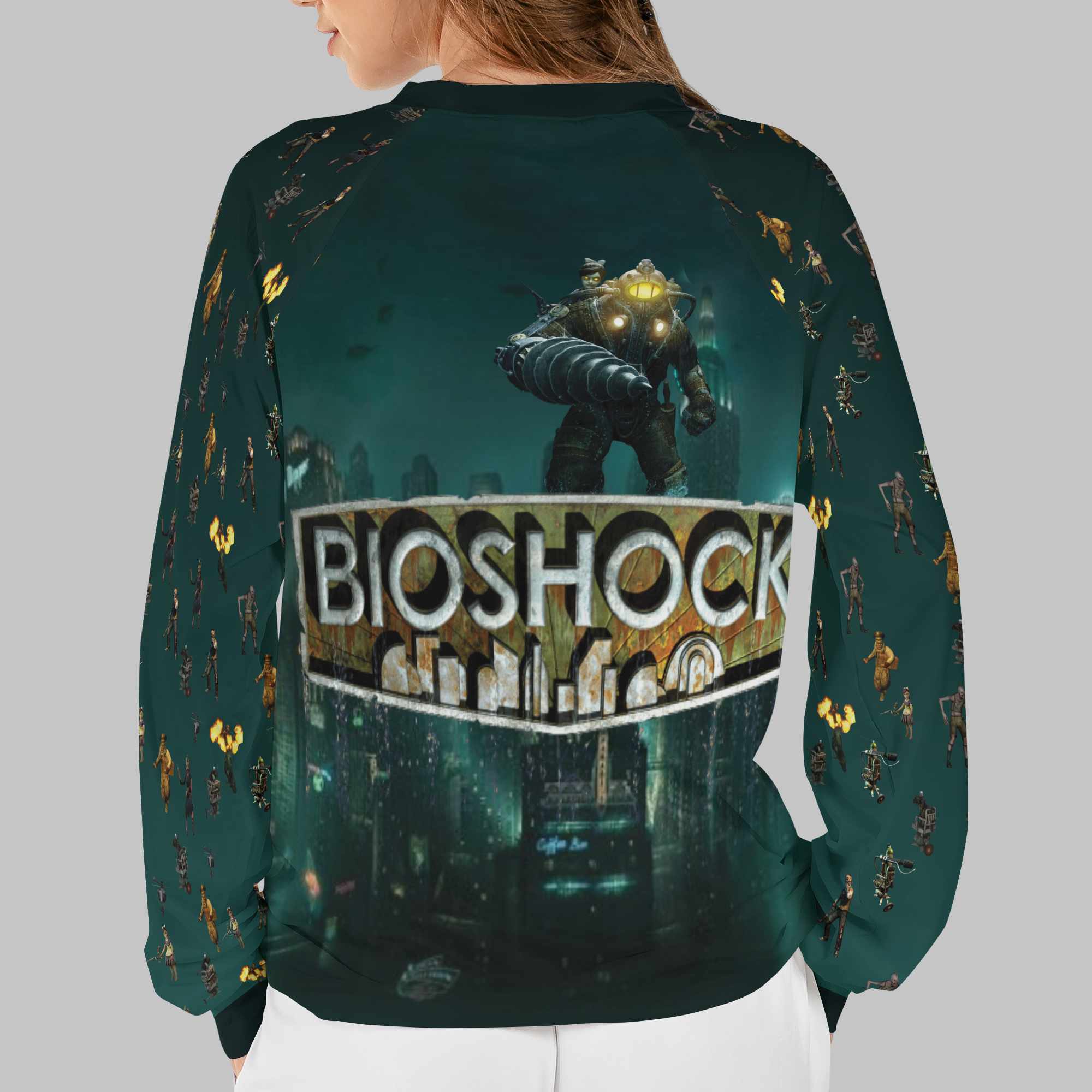 All over print pajamas set includes one long-sleeve raglan shirt and a pair of pants.